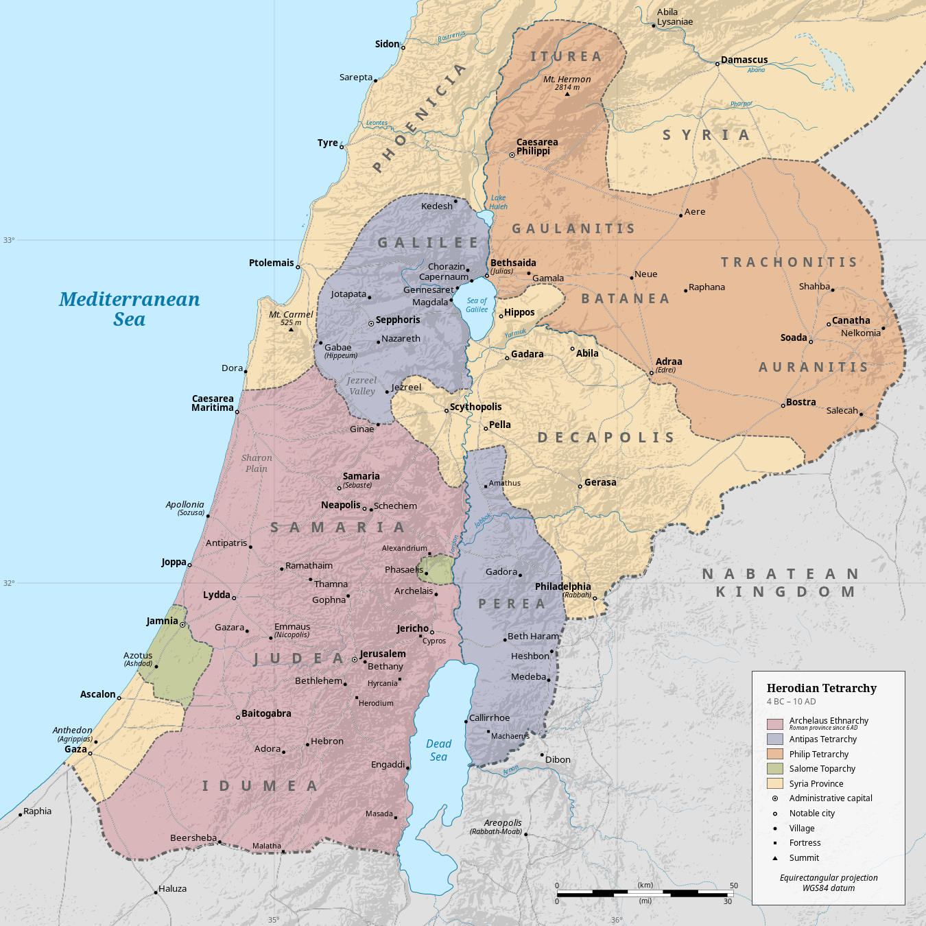 In the map below we see the three regions ruled by the sons of Herod the Great, after he died in 4 BC. The map “goes up to 10 AD,” probably because Herod Archelaus lost his region around that time.