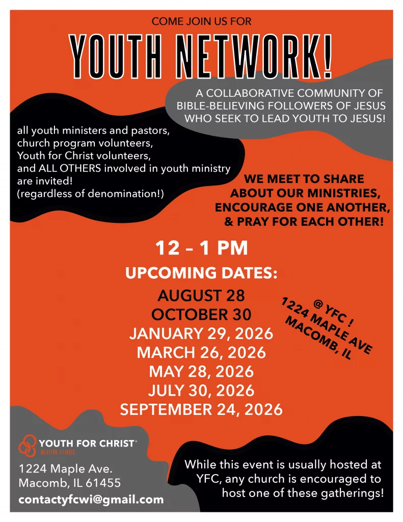 In July 2023, I went on the board for YFC of Western Illinois. We have YFC groups and activities in Bushnell and Macomb (for Middle School and High School youth).