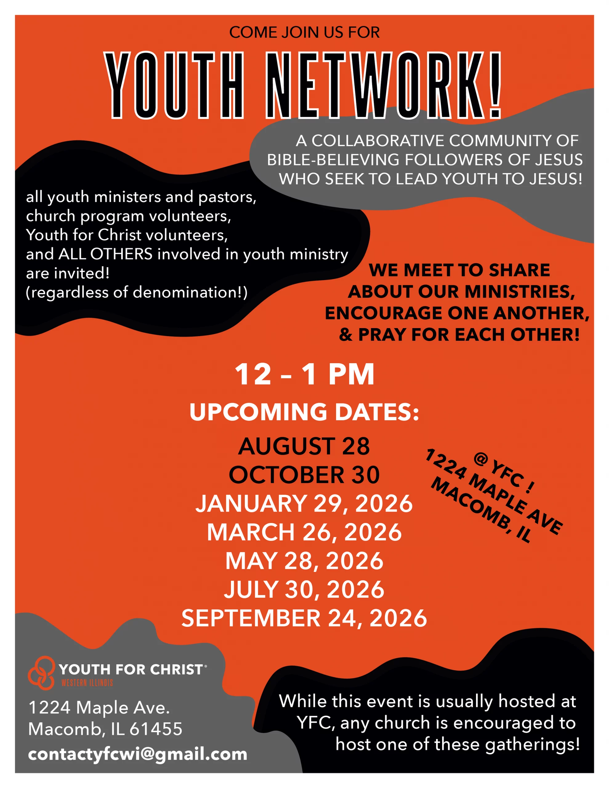 - Monthly Youth Network – noon – 1pm. Networking an d collaboration. See flier for dates.